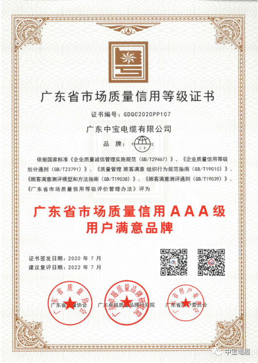 為加快推進(jìn)廣東省社會(huì)信用體系建設(shè),營(yíng)造誠(chéng)實(shí)、自律、守信的社會(huì)信用環(huán)境,近日,廣東省質(zhì)量協(xié)會(huì)、廣東卓越質(zhì)量品牌研究院、廣東省用戶(hù)委員會(huì)聯(lián)合公示了2020年廣東省市場(chǎng)質(zhì)量信用A等(用戶(hù)滿(mǎn)意)企業(yè)名單。中寶電纜憑借良好的信譽(yù)和口碑順利通過(guò)評(píng)審,被評(píng)為“廣東省市場(chǎng)質(zhì)量信用AAA級(jí)用戶(hù)滿(mǎn)意品牌”。